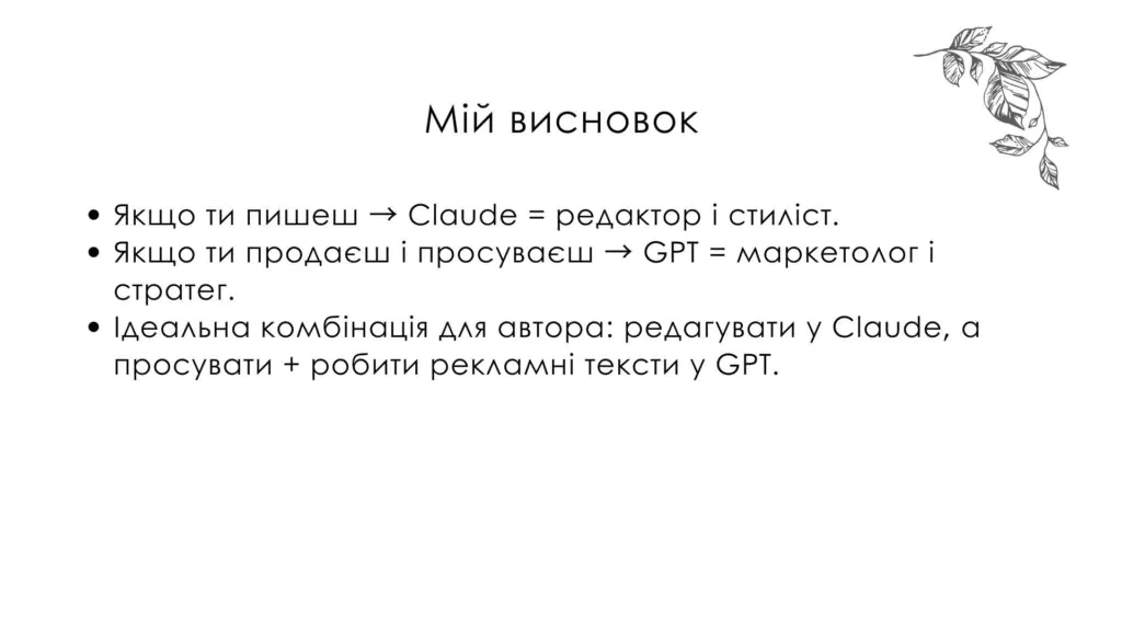 «Я проти авторів, які створюють тексти для своїх книг виключно за допомогою штучного інтелекту. Але я сама в своїй книзі дуже сильно його використовую — будую структуру, шукаю ідеї, а далі розписую своїми кейсами та знаннями».